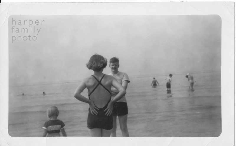 The elegant bathing beauty is my grandmother, facing her is my grandfather, and to the left is my mom. And I need to do my research, but I’d like to believe they are at the same beach we all still go to every year, but I am not sure.