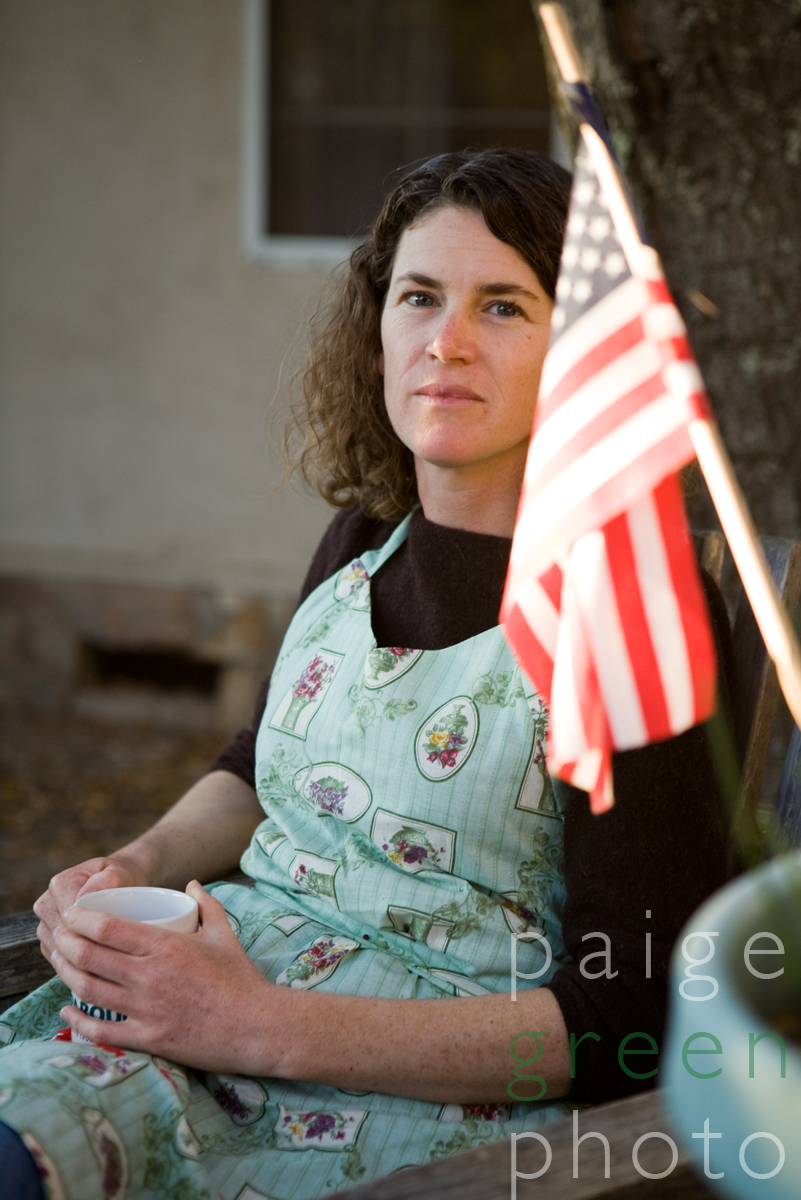 But I couldn’t resist this photo of my wonderful friend Rebecca, who was wearing her apron, after making her famous meatballs, and enjoying some tea by the glowing American flag in the last sun of the day.