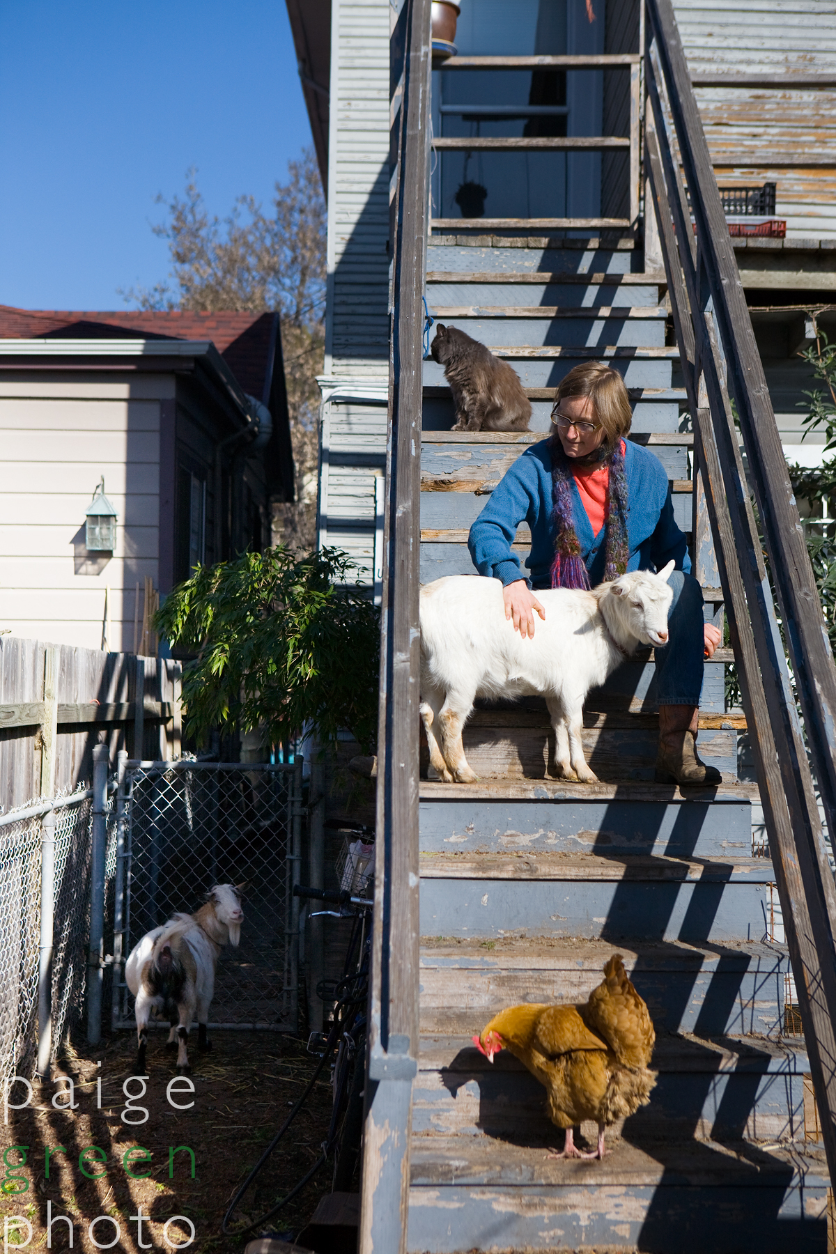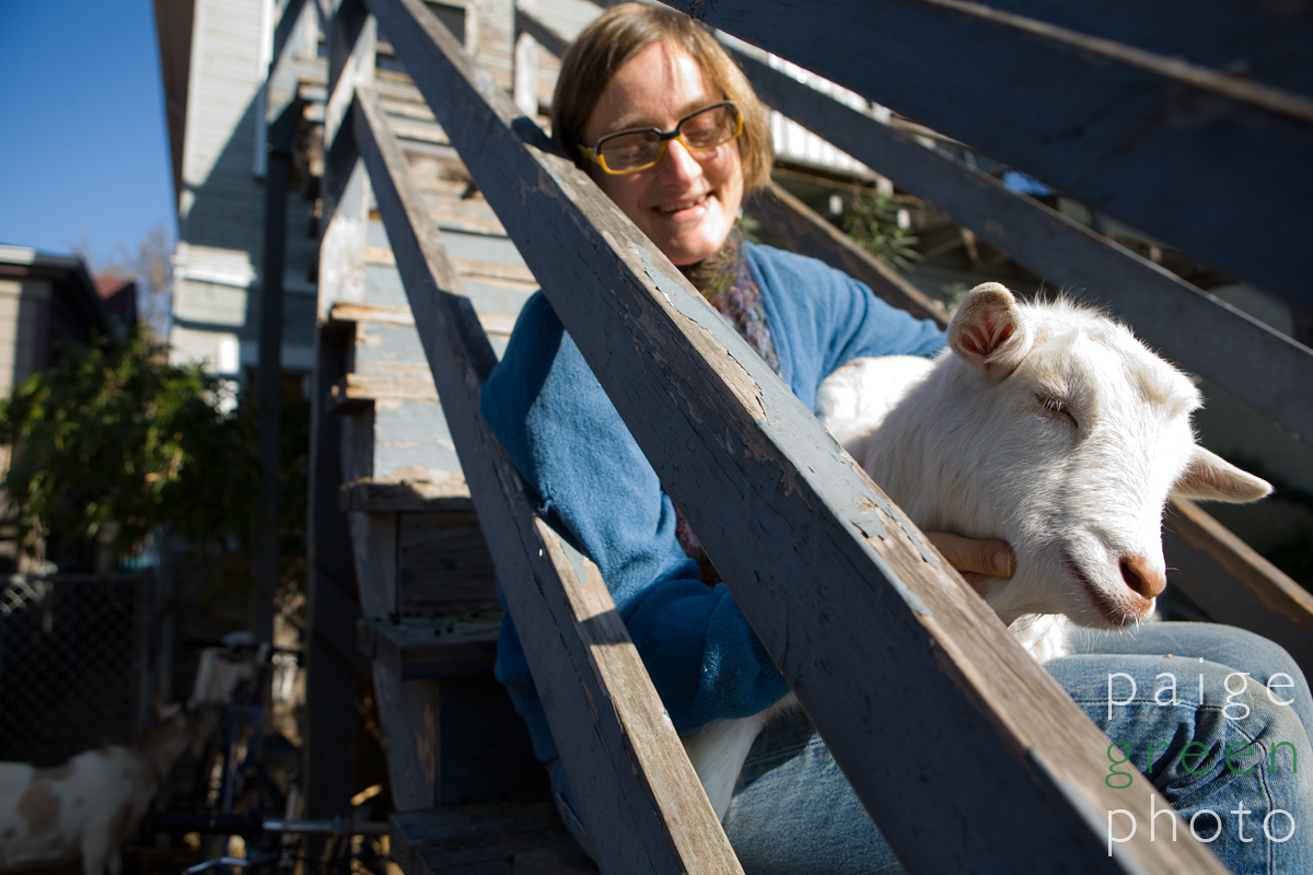 “I don’t want it to look too Martha-Stewart-like,” she said, as I climbed over her bio-diesel mechanic tools on the steps, and up through her kitchen filled with the morning’s leftovers sitting on dishes waiting to be washed, and out to her back porch where I was greeted by her Dwarf Nigerian goats on a paint peeling porch.