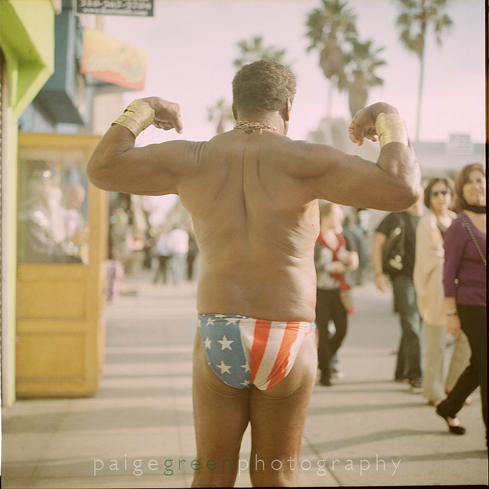 A 63-year-old hand-me-down American flag undies guy, who had more photos of himself with our dear governor Arnold, than he had teeth. He works out four times a week and it costs $2 to take his photograph… and he really wants you to take a picture of his butt.
