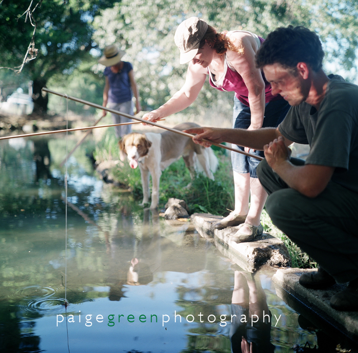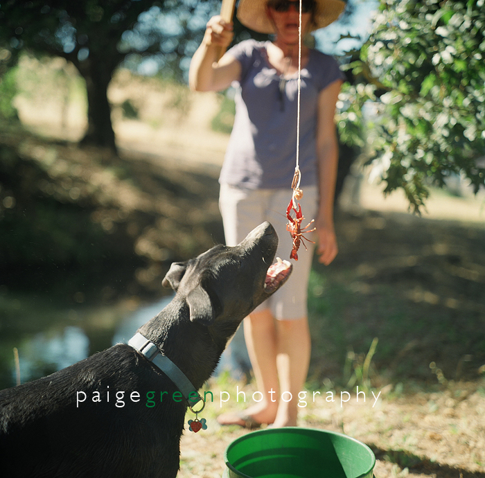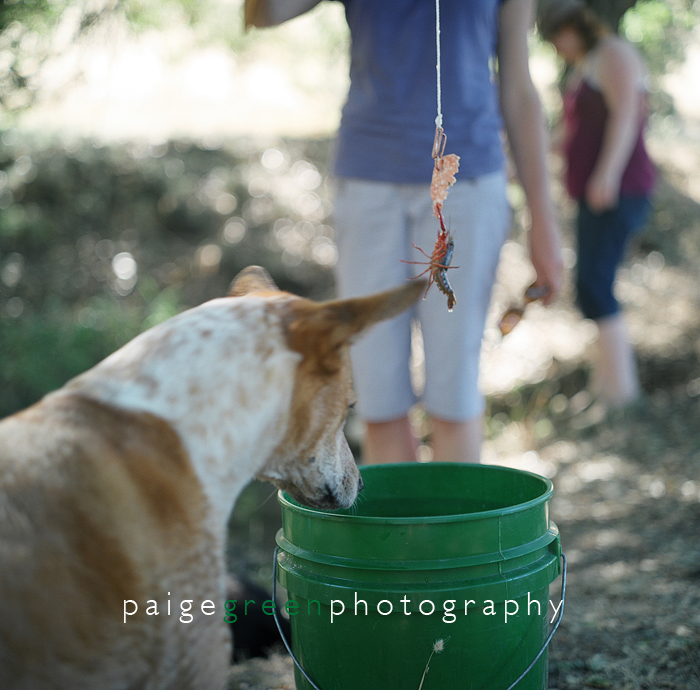 I learned that to hunt for crayfish, all you need is a garden stick, string, some sort of wire shaped into a hook for the salami and a pond. Beer, dogs and friends help too.